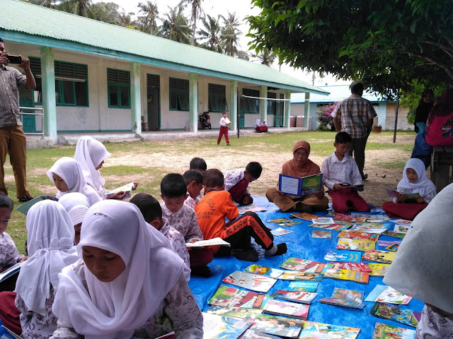 Jam menunjukkan pukul 10.00 Wib. Pertanda waktu istirahat di SD Deudap, Kecamatan Pulo Aceh, Kabupaten Aceh Besar. Hari itu 28 September 2016. Di samping ruang guru, terpal biru ukuran lima kali tiga meter terbentang. Ada 96 buku cerita anak-anak yang disusun berjejer di atasnya. Murid kelas 3 yang memiliki jadwal olahraga pagi itu pun lebih awal menyudahi permainan sepak bolanya. Hamparan buku yang digelar sejam sebelum istirahat tiba ternyata cukup menggoda.