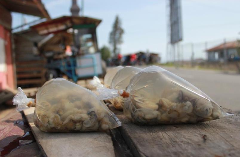 Pagi, sekira pukul delapan, ia mulai mengupas kulit tiram. “Paling banyak 13 kantong.” Saat mengupas, ia hanya memerlukan satu sikien catok, dan satu sarung tangan. Satu plastik tiram diukur dengan cangkir plastik setinggi jari telunjuk. Setelah diukur menggunakan cangkir, tiram yang telah dicuci bersih itu ditaruh dalam plastik berukuran 1 kg, lalu diisi air secukupnya, “Agar lebih tahan lama,” aku Nur.