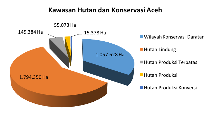 Berdasarkan Surat Keputusan Menteri Lingkungan Hidup dan Kehutanan Republik Indonesia Nomor: 859/MENLHK/SETJEN/PLA.2/11/2016 tanggal 11 November 2016 tentang Perubahan Kedua Atas Keputusan Menteri Kehutanan Nomor SK.865 /Menhut-II/2014 tentang Kawasan Hutan Aceh dan Konservasi Perairan Provinsi Aceh disebutkan bahwa Provinsi Aceh memiliki total luas Kawasan Hutan dan Konservasi seluas 3.563.813 ha yang terdiri atas Wilayah Konservasi Daratan 1.057.628 ha, Hutan Lindung (HL) 1.794.350 ha, Hutan Produksi Terbatas (HPT) 145.384 ha, Hutan Produksi (HP) 551.073 ha, dan Hutan Produksi Konversi (HPK) 15.378 ha.