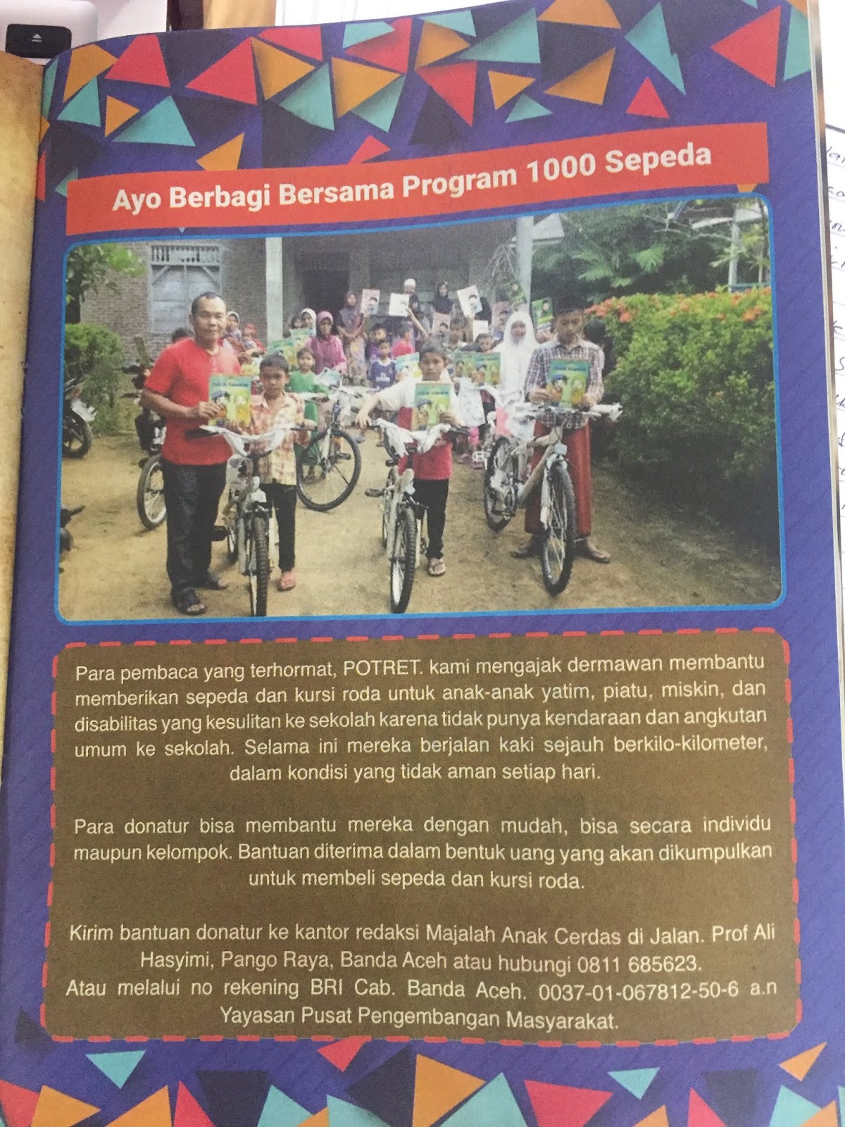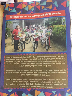 Paling tidak, program 1000 sepeda dan kursi roda untuk anak yatim, piatu, anak miskin dan disabilitas di Aceh telah menjadi kenderaan yang membawa penulis menembus pelosok-pelosok desa atau kampung di Aceh.