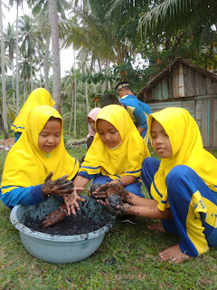 membawa 2 buah telur bebek yang akan digunakan untuk bahan praktik pembuatan telur asin, selain telur, abu dan garam serta beberapa peralatan lainnya juga telah disiapkan oleh para ustad dan ustazah (panggilan untuk guru) guna melakukan praktik home industri tersebut.