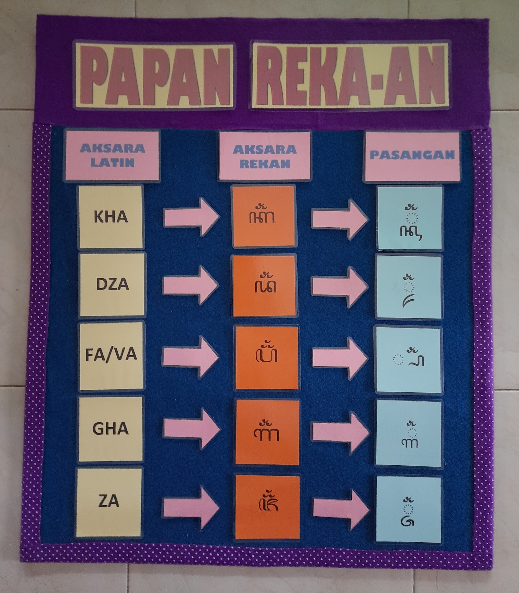 Masing-masing berjumlah 5. Alat peraga ini dibuat untuk memudahkan proses pembelajaran tatap muka, memudahkan peserta didik dalam mengenal, memahami dan menghafal bentuk aksara rekan dan pasangannya.