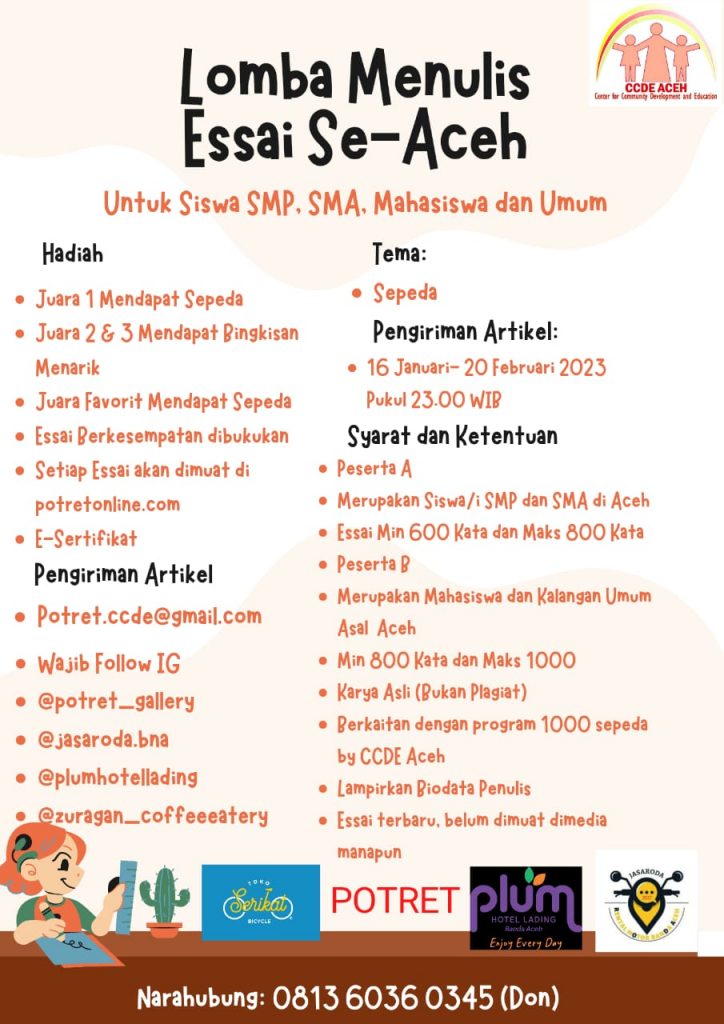 Potretonline.com- Banda Aceh – 23/01/23. Majalah POTRET yang kini bermetamorfosis menjadi media online, www.potretonline.com, menggelar lomba menulis essai bertemakan ‘sepeda’ untuk siswa, mahasiswa dan umum. Hal itu disampaikan Tabrani Yunis pimpinan Majalah POTRET Minggu (22/01/2023).
