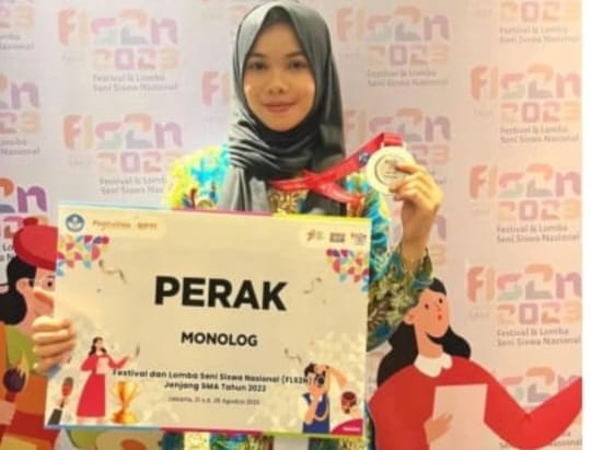 BANDA ACEH. Potretonline.com- Chiwi Putri Annajah, siswi SMA Negeri 1 Sinabang Kabupaten Simeulue membanggakan Provinsi Aceh. Pasalnya dia mampu meraih medali perak tingkat nasional pada ajang Festival dan Lomba Seni Siswa Nasional (FLS2N) jenjang SMA tahun 2023.