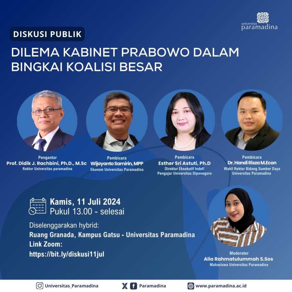 Jakarta- Potretonline.com- Universitas Paramadina, Kamis 11 Juli 2024 mengadakan diskusi publik yang mengangkat tema “ Dilema Kabinet Prabowo Dalam Bingkai Koalisi Besar”.’Diskusi tersebut berlangsung di ruang Granada, Kampus Gatsu, Universitas Paramadina secara hybrid melalui Zoom meeting. Diskusi tersebut dimoderatori oleh Alia Ramatulummah, mahasiswa Universitas Paramadina dengan menghadirkan 3 pembicara, masing-masing Wijayanto Samirin,MPP, adalah ekonom Universitas Paramadina,