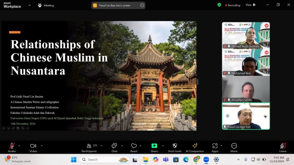 Dari Tiongkok, Prof. Yusuf Liu Bou Jun dari Chinese Muslim Association membahas hubungan komunitas Muslim Tiongkok dengan masyarakat Muslim di Nusantara melalui presentasinya berjudul “Relationships of Chinese Muslims in Nusantara”. Prof. Liu mengeksplorasi bagaimana nilai-nilai agama dan budaya lokal berinteraksi dalam kehidupan sehari-hari, serta perpaduan antara tradisi Islam Cina dan budaya lokal di Indonesia dan Asia Tenggara.