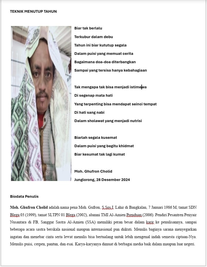 Moh. Ghufron Cholid adalah nama pena Moh. Gufron, S.Sos.I. Lahir di Bangkalan, 7 Januari 1986 M, tamat SDN Blega 03 (1999), tamat SLTPN 01 Blega (2002), alumni TMI Al-Amien Prenduan (2006). Pendiri Pesantren Penyair Nusantara di FB, Sanggar Sastra Al-Amien (SSA) memiliki peran besar dalam karir ke penulisannya, sampai beberapa acara sastra berskala nasional maupun internasional pun diikuti. Menulis baginya sarana menyegarkan ingatan dan menebar cinta serta lewat menulis bisa bertualang untuk lebih mengenal indah semesta ciptaan-Nya. Menulis puisi, cerpen, pantun, dan esai.