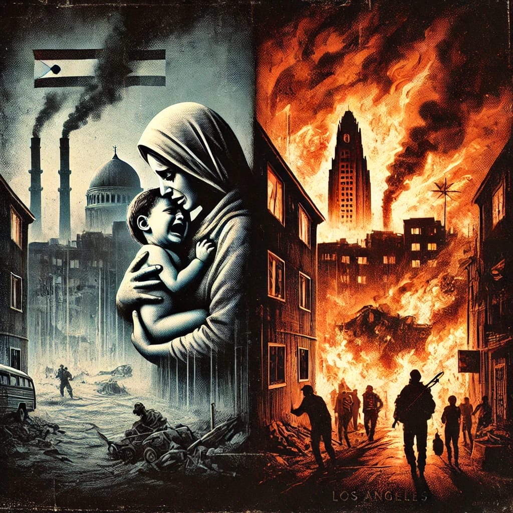 Gaza, Los Angeles. Jarak mereka ribuan kilometer, tapi deritanya sama, hilangnya nyawa, hancurnya harapan, langit yang berubah menjadi abu. Bedanya hanya pada siapa yang menonton dan siapa yang diam.