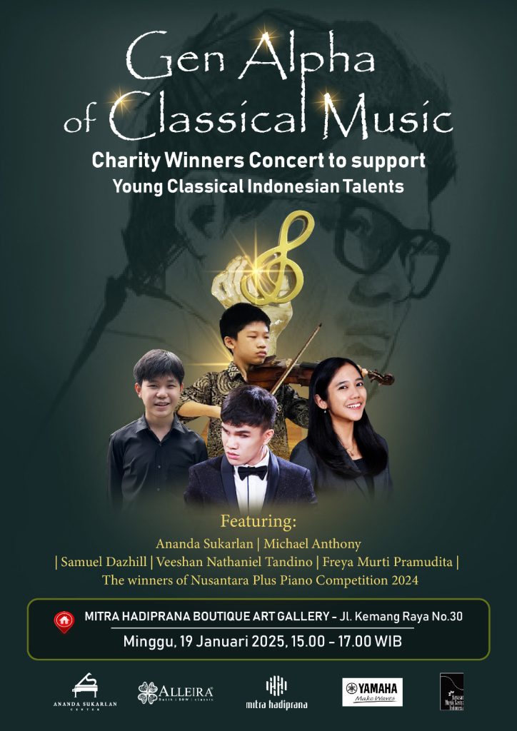 Mereka adalah pemain biola Veeshan Nathaniel Tandino dan soprano Freya Murti Pramudita (para pemenang Kompetisi Piano Nusantara Plus 2024-red), serta pianis Samuel Dazhill dan Michael Anthony. Konser bertajuk “Gen Alpha of Classical Music” itu akan berlangsung di Galeri Seni Hadiprana di bilangan Kemang, Jakarta Selatan, pukul 3 sore.