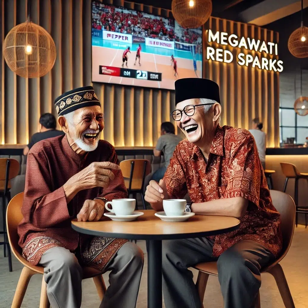 Di sebuah sudut kafe hipster di Jalan Ayani, Wak Dalek dan Wan Dolah, dua sahabat sejati yang rambutnya mulai menyerupai kapas tua, tengah duduk sambil menyeruput kopi overpriced. Dua gelas cappuccino berharga sepiring sate kambing di warkop langganan mereka, tapi siapa peduli? Ini demi gengsi pagi itu, karena mereka menunggu live streaming pertandingan voli Korea antara tim Megawati, Red Sparks melawan AI Pepper.