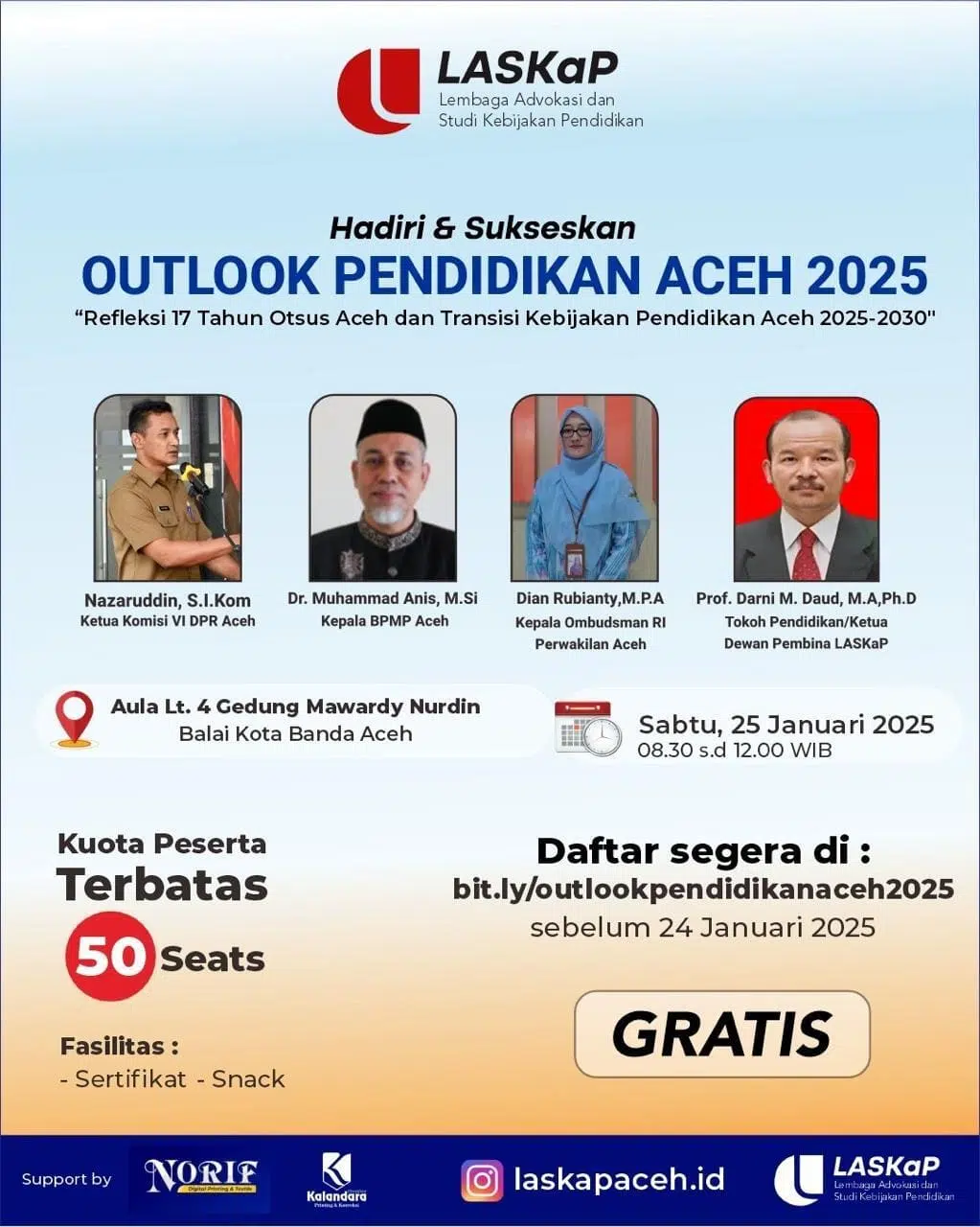 Di dalam ruangan, aku hanya melihat sedikit orang. Belum Kulihat seperempat dari koata peserta yang kantanya hanya untuk 50 orang. Aku terdiam dan melihat flier acara yang menjadi backdrop di panggung. Aku membaca nama-nama narasumber yang ditera di flier.