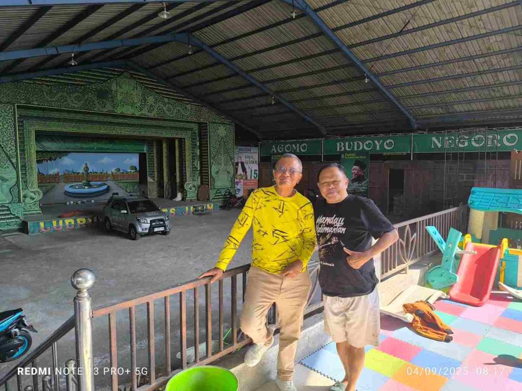 Dahlan Iskan dan Kirun di depan tobong di Padepokan Seni Kirun di Madiun. -Foto: Tomy Gutomo-Harian Disway