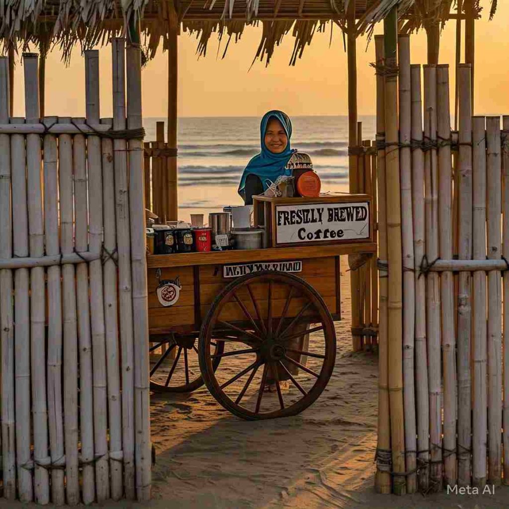 “Lebih baik aku ke pantai aja, siapa tahu ada yang mau ngopi. Kan kata Pak Sekdes, ada pekerja yang mau pasang bambu di laut, ” pikir Bu Midah.