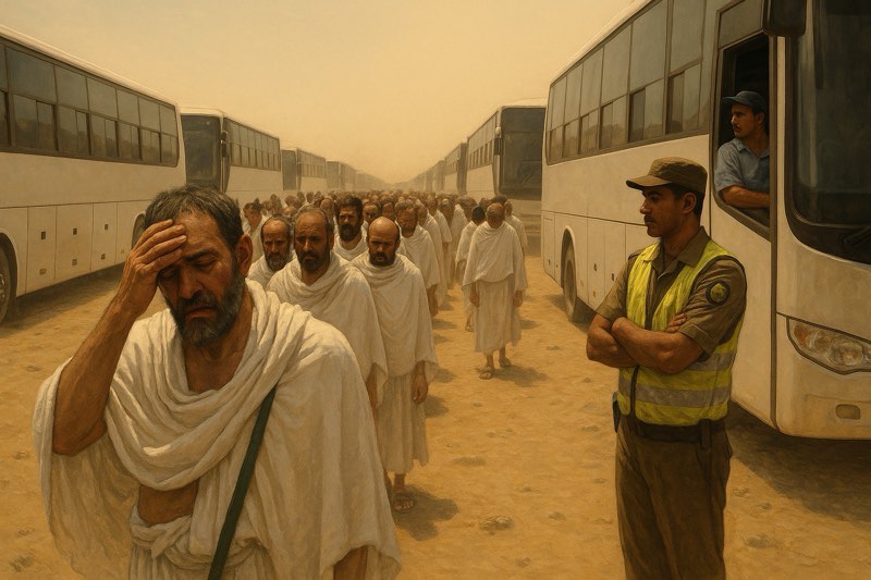 Bus-bus yang seharusnya datang tepat waktu bagai kafilah terorganisir, ternyata bagai unta lepas kendali. Ribuan jamaah harus sabar menunggu—bukan satu atau dua jam, melainkan empat jam lebih. Tubuh letih, mata mengantuk, kaki pegal, tapi antrian belum juga bergeser.
