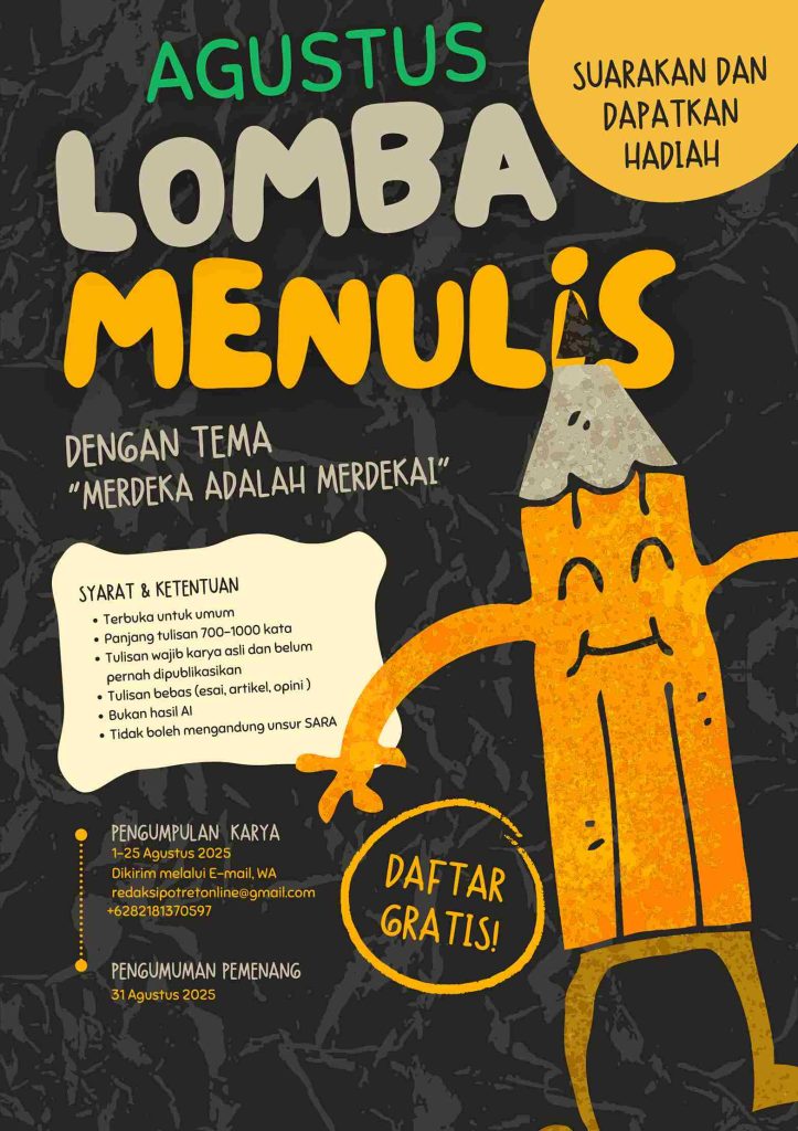 Adapaun tema lomba menulis bulan Agustus 2025 adalah; “Merdeka adalah Merdeka”. Anda dapat mengirimkan naskah terbaik Anda melalui whatsapp redaksi, email redaksi maupun kolom kirim tulisan. Anda dapat mengirimkan lebih dari satu naskah. Sertakan hastag #bulanmerdeka #potretonline #lombamenulisagustus di akhir tulisan Anda. Tulisan dapat dikirim mulai 1 Agustus sampai 25 Agustus.