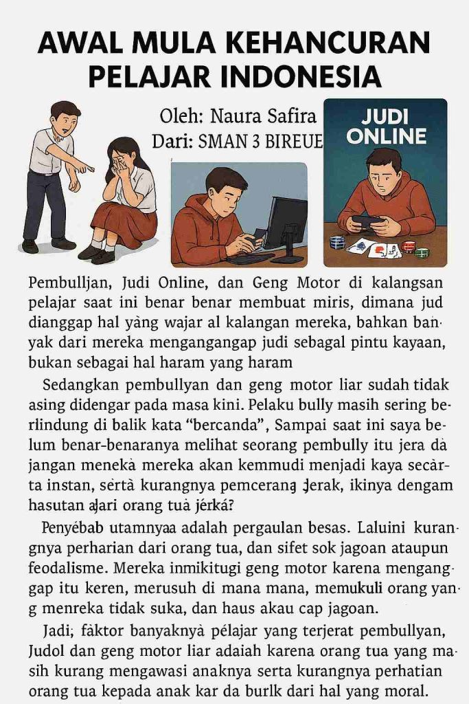 Pembullian, Judi online, dan Geng Motor di kalangan pelajar saat ini benar-benar membuat miris, dimana judi sudah dianggap hal yang wajar di kalangan mereka, bahkan banyak dari mereka yang menganggap judi sebagai pintu dari kekayaan, bukan sebagai hal haram yang haram dihindari.