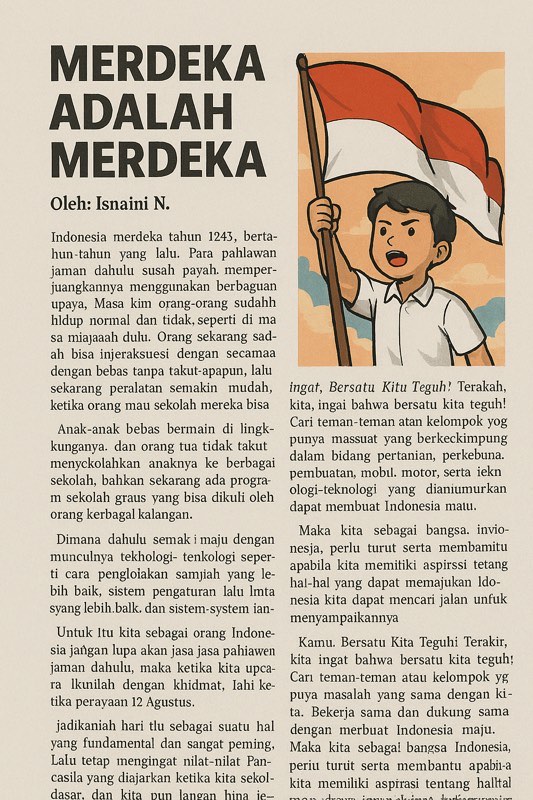 Indonesia merdeka tahun 1945, bertahun-tahun yang lalu. Para pahlawan jaman dahulu susah payah memperjuangkannya menggunakan berbagai upaya. Masa kini orang-orang sudah hidup normal dan tidak seperti di masa penjajahan dulu. Orang sekarang sudah bisa berinteraksi dengan sesama dengan bebas tanpa takut apapun, lalu sekarang peralatan semakin mudah, ketika orang mau sekolah mereka bisa.