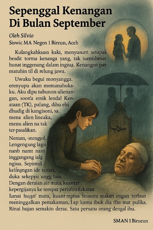 Awan menggantung hitam di cakrawala. Seiring gerimis turun perlahan. Seakan turut merasakan, duka sekeping hatiku yang lara. Dengan deraian air mata, kuantar kepergiannya ke tempat peristirahatannya yang terakhir. Rinai hujan semakin deras. Satu persatu orang orang mulai meninggalkan pemakaman. Tapi aku, ibuku dan keluarga lainya seakan enggan untuk beranjak.