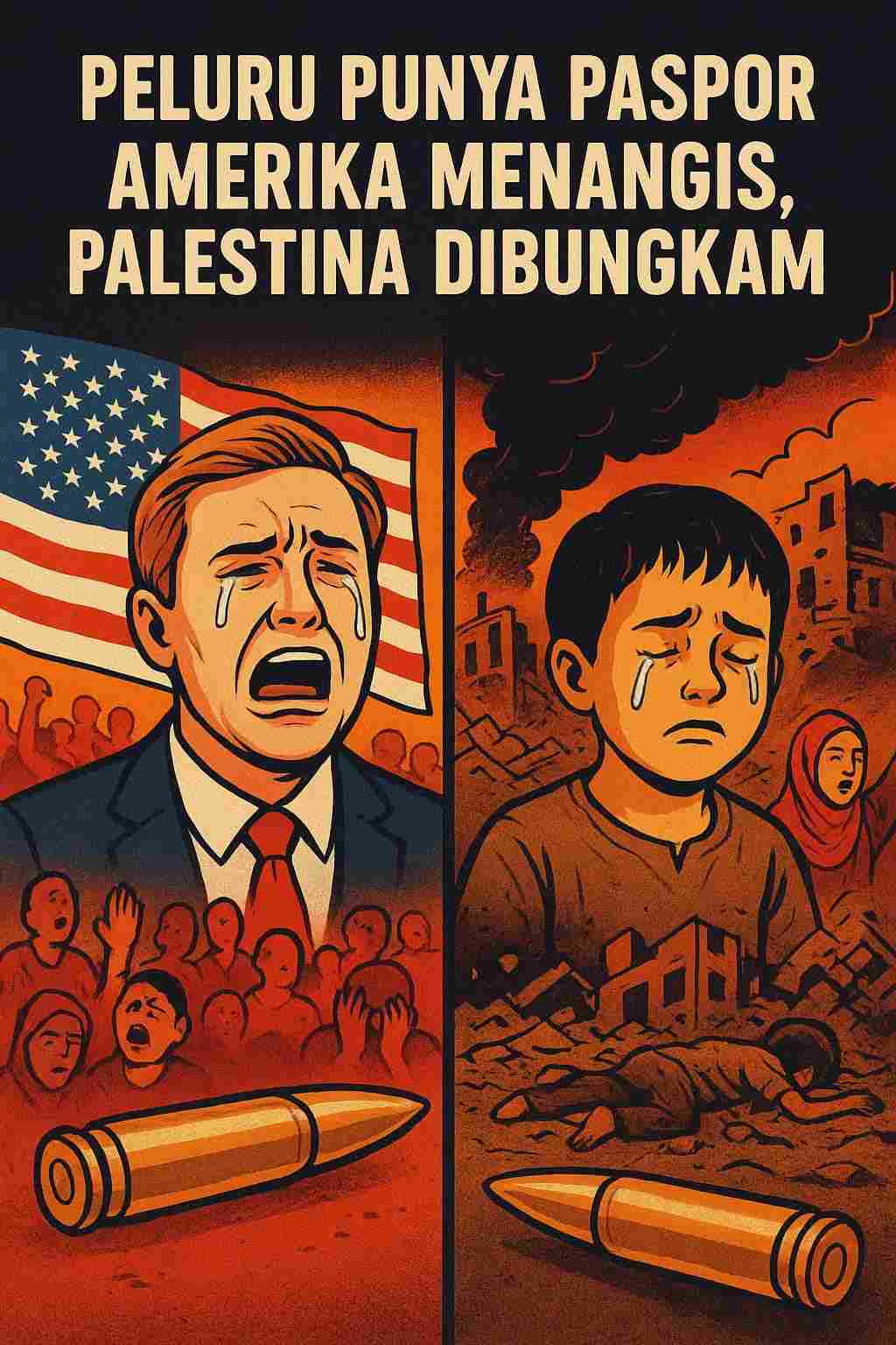Namun mari kita geser layar, dari Utah ke Gaza. Di sana, anak-anak Palestina ditembak, sekolah rata dengan tanah, rumah sakit jadi puing, dan dunia? Sunyi. Tidak ada trending, tidak ada konser amal, bahkan kadang sekadar doa di Instagram pun malu-malu. Ironisnya, sebagian besar peluru yang menghantam tubuh mungil itu dibeli dengan dolar yang disumbangkan Washington. Jadi, Amerika tidak hanya hadir sebagai wasit, tapi juga sebagai pemasok bola, peluit, bahkan tribun sorak.