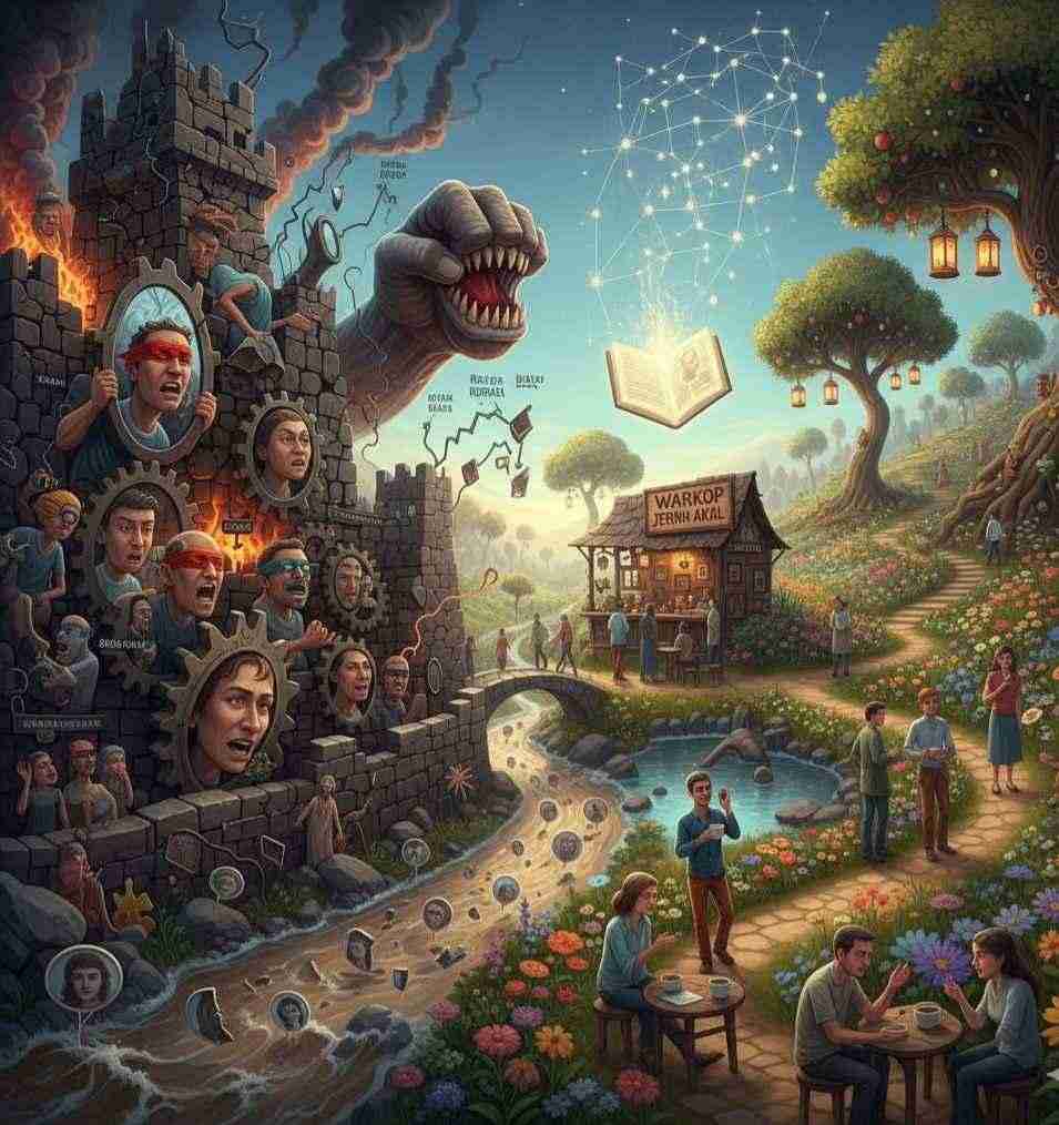 Di sekitar jalan pikiran, ada pemandangan menawan, ada kerusakan pikiran yang dilakukan para pembabat hutan kebenaran. Di depan, barangkali ada warkop yang menyajikan kopi polos, kopi bergula, robusta atau arabika. Istirahat sejenak sambil berpikir, apakah pandangan kita sudah benar, atau itu hanya konstruksi budaya, agama, sosial, pendidikan serta keyakinan yang seperempat saja kita pahami. Coba periksa dengan instrumen yang diberikan Allah Azza wa Jalla.