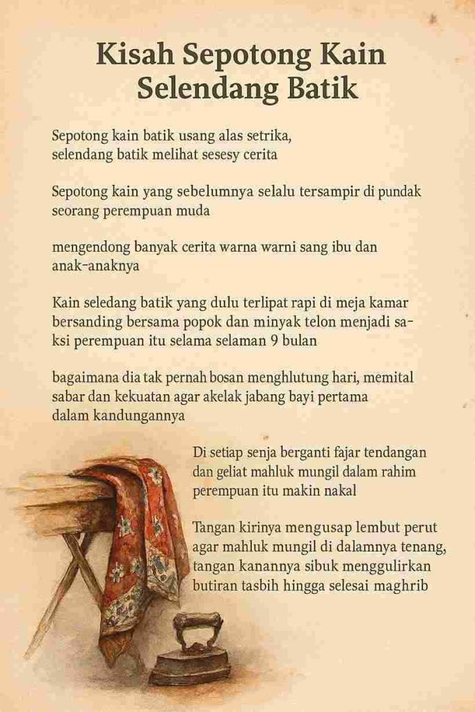 Seiring rambut perempuan itu mulai memutih,dari meja setrika, selendang batik melihat sesekali perempuan ini meneteskan air mata