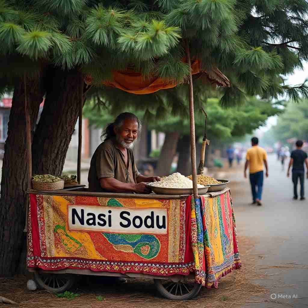 Kokoh dan masih berdiri, tampak berjualan. Gerobak itu terbukti setiap pagi kulihat saat aku melintas di jalan itu. Kendati hanya satu atau dua orang saja yang membeli. Produk dagangan si pria itu masih bertahan. Meski negeri ini katanya sudah diambang krisis parah, namun daya beli penikmat Nasek Sodu masih kurasa kuat.