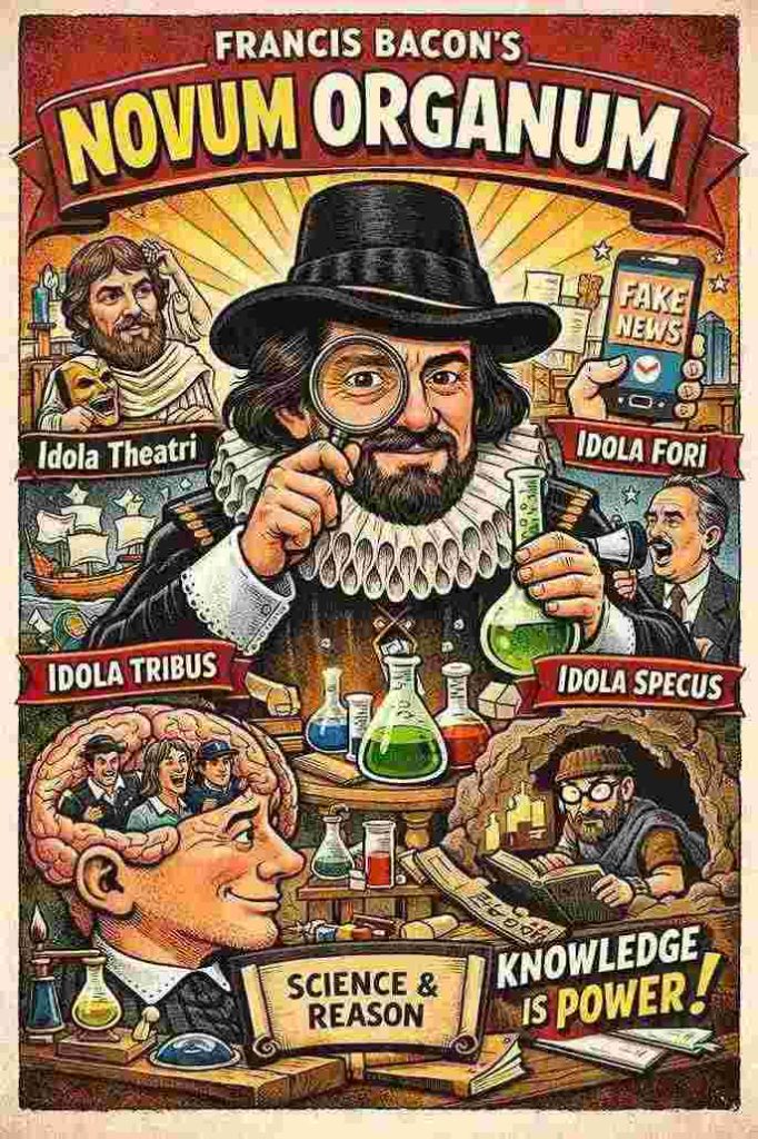 Bacon menantang tradisi lama yang tunduk pada otoritas dan spekulasi. Ia menawarkan “alat baru” bagi akal manusia: metode berpikir berbasis observasi, eksperimen, dan disiplin intelektual. Di dalamnya, ia memperkenalkan konsep terkenal tentang Idola—bias-bias yang mengaburkan kebenaran—yang hingga hari ini terasa sangat aktual dalam menghadapi hoaks, polarisasi politik, dan manipulasi bahasa publik.