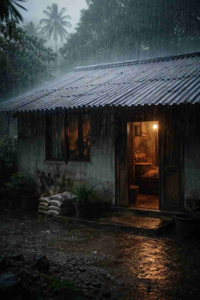 Hujan turun pelan, lalu tiba-tiba deras. Airnya menghantam atap seng rumah kami yang tak berplafon, suaranya keras memenuhi seluruh ruangan.