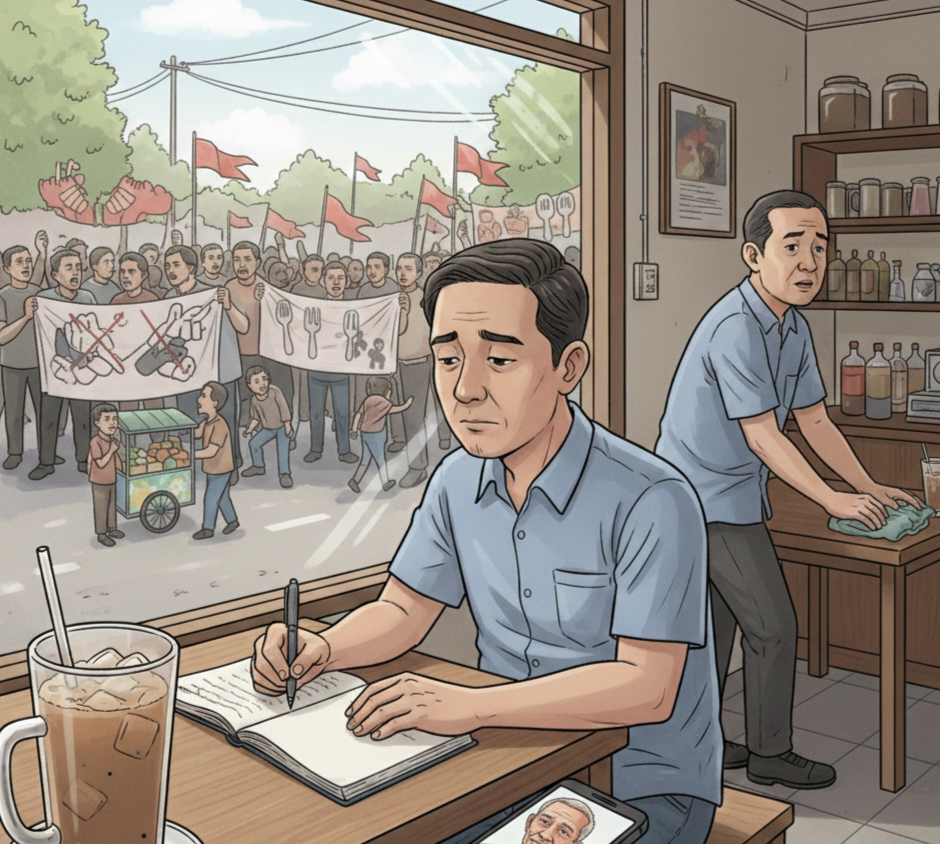 “Lek,” Syarif berbisik pada bayangannya di kaca warung kopi. “Ternyata lebih mudah mencari jarum di tumpukan jerami daripada mencari ketulusan di tumpukan spanduk demo.”