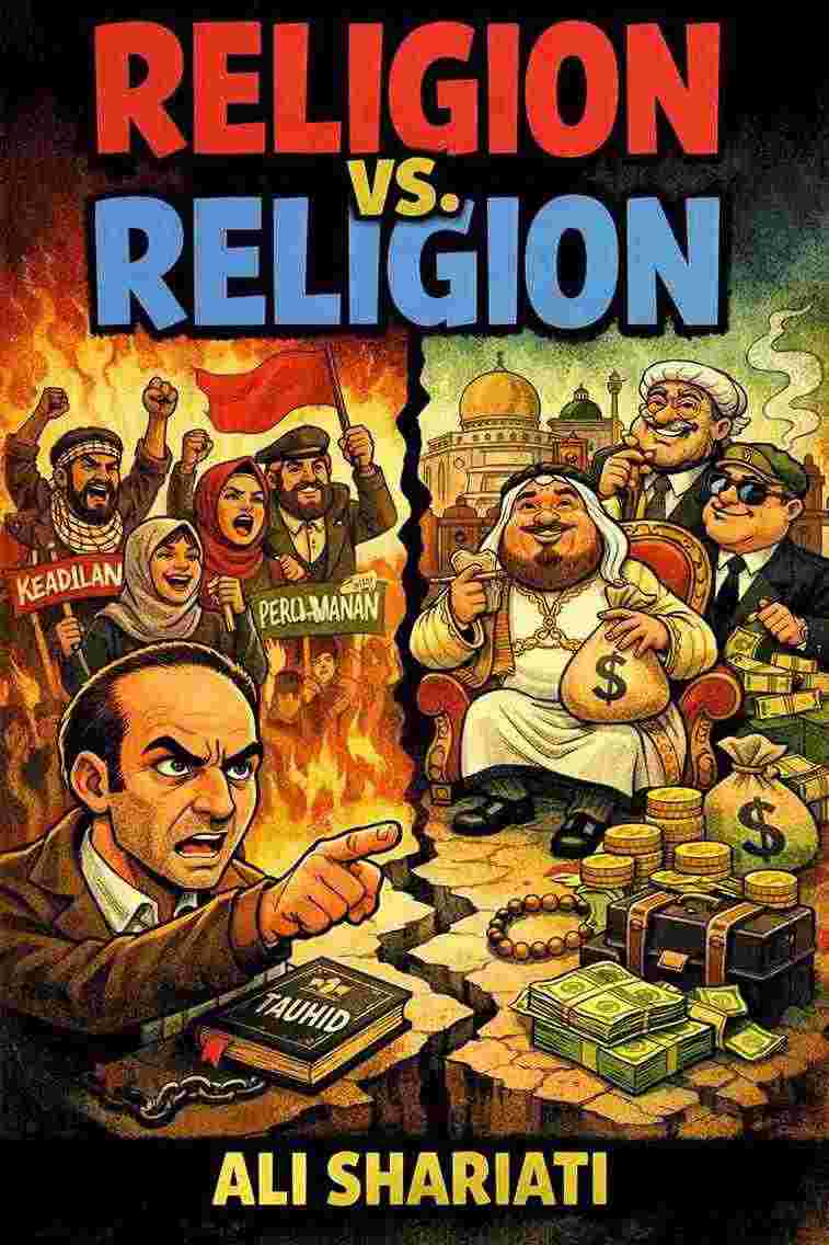 Shariati mengajukan tesis yang mengguncang: konflik terbesar manusia bukanlah antara agama dan ateisme, melainkan antara dua jenis agama—agama pembebasan dan agama kekuasaan.
