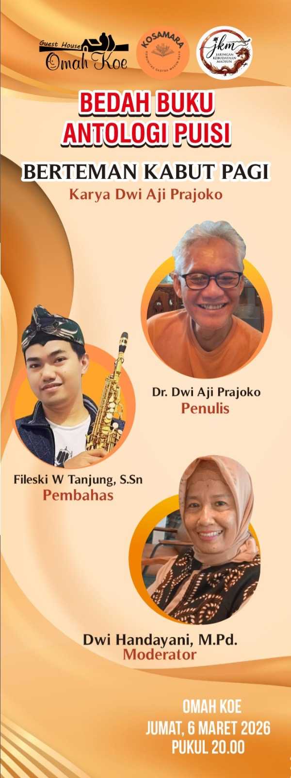Pada malam Jumat, 6 Maret 2026, selepas solat tarawih, sebuah guest house bernama Omahkoe di Kota Madiun berubah menjadi ruang percakapan kebudayaan. Di sana berlangsung bedah buku antologi puisi Berteman Kabut Pagi karya Dwi Aji Prajoko, acara ini terselenggara hasil kerja sama Kosamara (Komunitas Sastra Madiun Raya), Jaringan Kebudayaan Madiun, Komunitas Rusa Terbang, Negeri Kertas, dan Omahkoe Guest House.