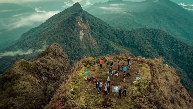 Rizky (aktivis) duduk bersila menghadap penonton, namun penonton adalah arah gunung. Di depannya ada sesaji sederhana: daun sirih, pinang, gambir, sedikit beras, dan lilin kecil yang menyala redup.